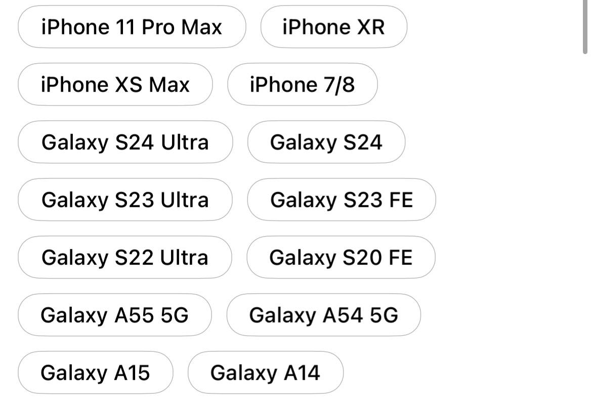 Galaxy A14, Galaxy A15, Galaxy A54 5G, Galaxy A55 5G, Galaxy S20 FE, Galaxy S22 Ultra, Galaxy s23 FE, Galaxy S23 Ultra, Galaxy S24, Galaxy S24 Ultra, iphone 11, iPhone 11 pro, iphone 11 Pro Max, iphone 12, iPhone 12 Pro, iPhone 12 Pro Max, IPhone 13, iPhone 13 Pro, iPhone 13 Pro Max, iPhone 14, iPhone 14 Plus, iPhone 14 Pro, iPhone 14 Pro Max, iPhone 15, iPhone 15 Plus, iPhone 15 Pro, iPhone 15 Pro Max, Iphone 16, Iphone 16 Plus, iPhone 16 Pro, iPhone 16 Pro Max, iPhone 7/8, iphone XR, iphone XS Max